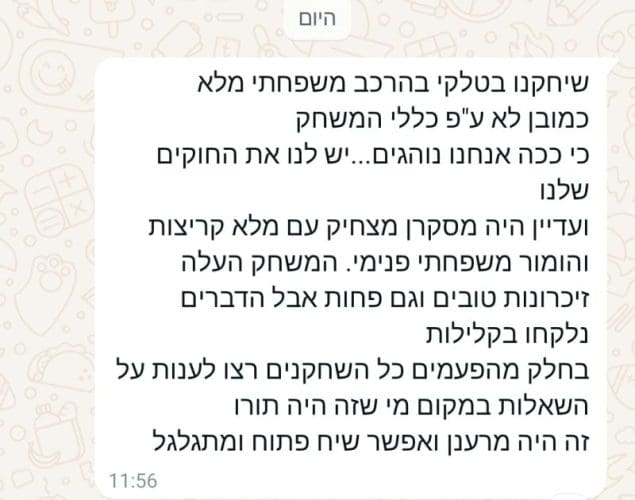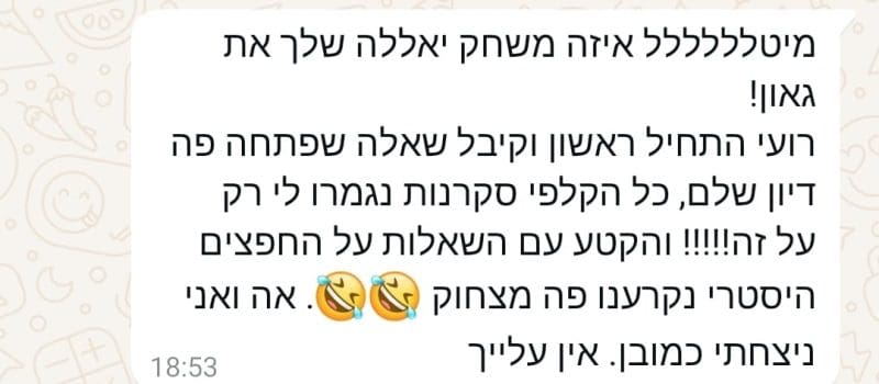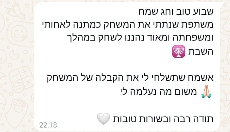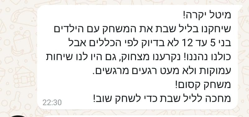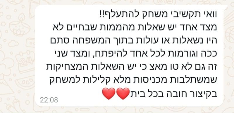 המשחק בנוי בצורה כיפיית, תחרותית ומומלץ לכל מי שרוצה להכיר יותר, להתחבר ולייצר זמן איכות.