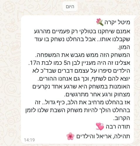 בשנה האחרונה, יחד עם משפחתי, תוך סבבי מילואים שלא נגמרים פיתחנו את "טולקי" – משחק חווייתי שמאפשר שיח עמוק, מצחיק ומחבר בין אנשים. המשחק נולד מתוך הבנה שבעידן של וואטסאפ, אימוג'ים והודעות קצרות, אנשים כמעט ולא מדברים באמת. "טולקי" הוא ההזדמנות לעצור, להקשיב ולגלות מחדש את הקרובים אלינו – בדרך הכי מהנה שיש!