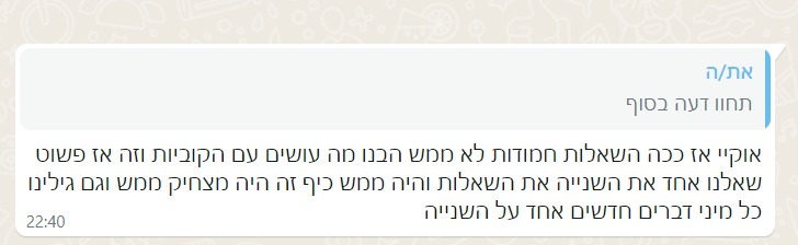 ✅ שובר את הקרח ומייצר חיבור מיידי בין משתתפים ✅ מעורר צחוק, עומק ושיח זורם ✅ חוויה תחרותית ומגבשת לכל המשפחה ולחברים